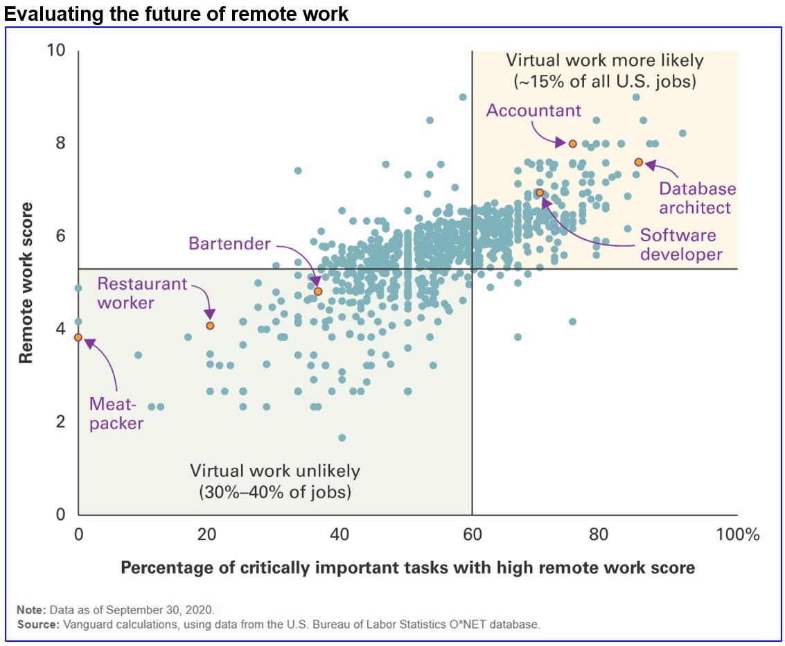 In the Vanguard Economic and Market Outlook 2021: Approaching the Dawn, we further discuss trends that may have been either accelerated (such as remote work) or altered by Covid-19 and assess their economic and market implications.