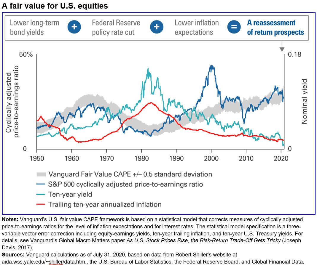 Vanguard’s proprietary fair value CAPE (cyclically adjusted price-to-earnings ratio) framework models the relationship among equity valuations, long-term bond yields, and inflation. It shows a fair value range that has moved higher since the first quarter. Interestingly, the S&P 500 CAPE at the end of July falls right in the middle of this range, meaning that valuations as of that date are fair based on interest rates and inflation, which we view as a proxy for the required rate of return.