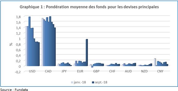 Le Graphique 1 illustre le pourcentage moyen d'espèces dans les fonds de placement canadiens pour neuf devises principales, dans un ordre séquentiel de janvier 2018 à septembre 2018. Le dollar américain a affiché un déclin de 2,7 % sur un mois pour la période se terminant le 30 septembre 2018, tandis que le dollar canadien a perdu 8,1 %. De même, le yen japonais (JPY) a perdu 65,1 %, l'euro (EUR) a gagné 538,3 %, la livre britannique (GBP) a chuté de 5,3 %, le franc suisse (CHF) a avancé de 10,0 %, le dollar australien (AUD) a augmenté de 11,7 %, le dollar néo-zélandais (NZD) a progressé de 37,5 % et le yuan chinois (CNY) a reculé de 55,7 %.