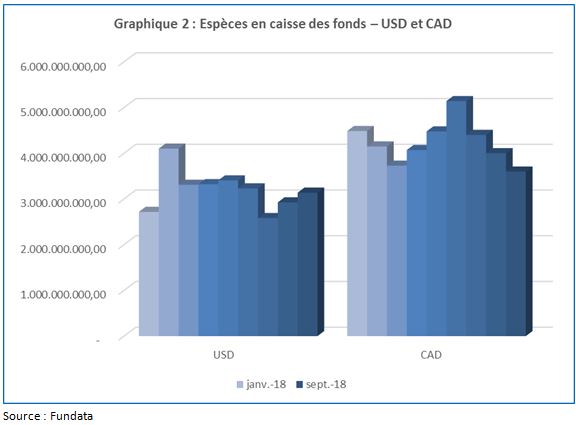 Le Graphique 2 illustre la valeur moyenne des espèces en dollars, dans un ordre séquentiel de janvier 2018 à septembre 2018. Le dollar américain avait une position nette de 3 137 653 004 $ en septembre 2018. Le dollar canadien avait une position nette de 3 598 346 911 $ en septembre 2018.