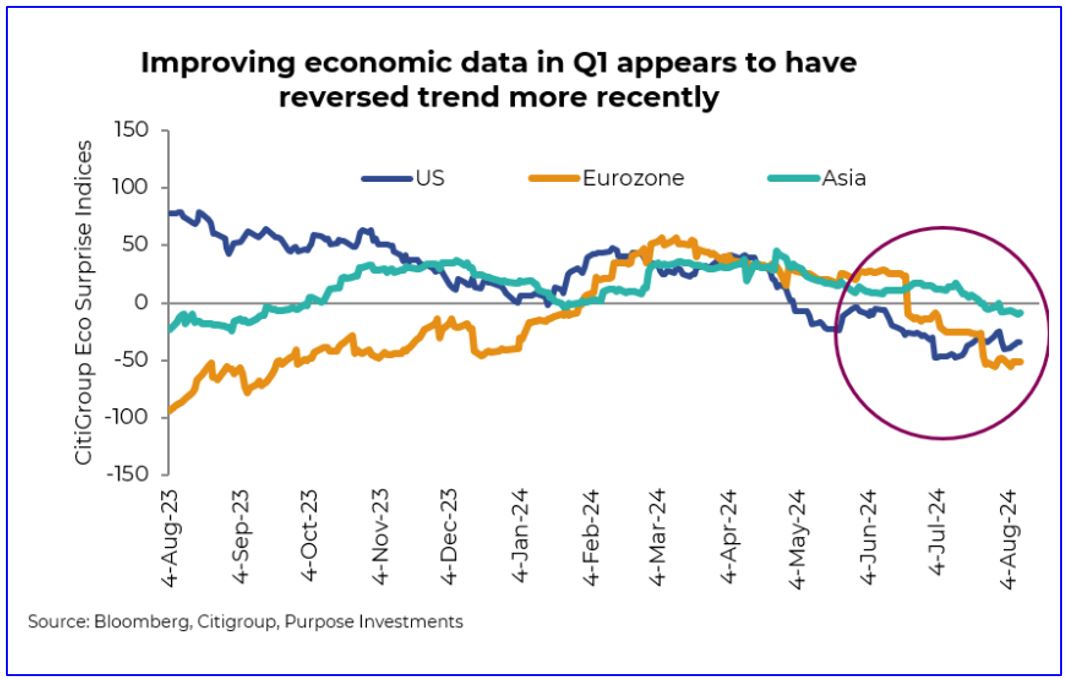 Il ne fait aucun doute que les données économiques se sont quelque peu affaiblies. Ce n’est pas une nouvelle non plus; en fait, après un T1 et une partie du T2 très solides, les données ont commencé à se retourner. Cela s'est produit d'abord aux États-Unis et, plus récemment, dans le monde entier. Le graphique ci-dessous représente l’indice de surprise économique de Citigroup, qui mesure les données par rapport au consensus, ajusté en fonction de l’importance de la publication des données. Désolé, le Canada n’est pas sur la même longueur d’onde, mais le tableau est semblable : solide pendant une bonne partie de 2024, puis négatif. Cette évolution a été alimentée par la faiblesse du rapport sur l’emploi du 9 août.