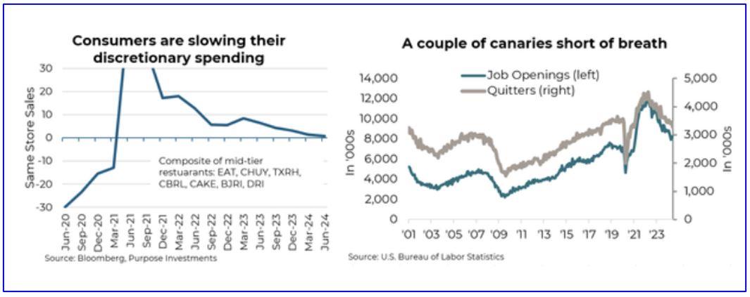 Les consommateurs américains ont réduit leurs habitudes de consommation, ce qui est souvent un signe de stress ou de repli. Il y a plusieurs mois, nous avons commencé à souligner la hausse des paiements en retard par carte de crédit et des ventes des restaurants comparables (voir le graphique ci-dessous à gauche). Et les anecdotes n’ont cessé d’affluer. Il s’agissait censément d’un voyage d’été pour les compagnies aériennes, car la capacité demeure limitée (il semble qu’un important avionneur soit en retard) et les prix sont élevés. Les sièges ne se vendaient pas, et de nombreuses compagnies ont commencé à baisser leur prix. Walmart a souligné l’augmentation des dépenses chez les clients plus riches. Le retour des riches chez Walmart n’est pas un bon signe. La liste est longue.