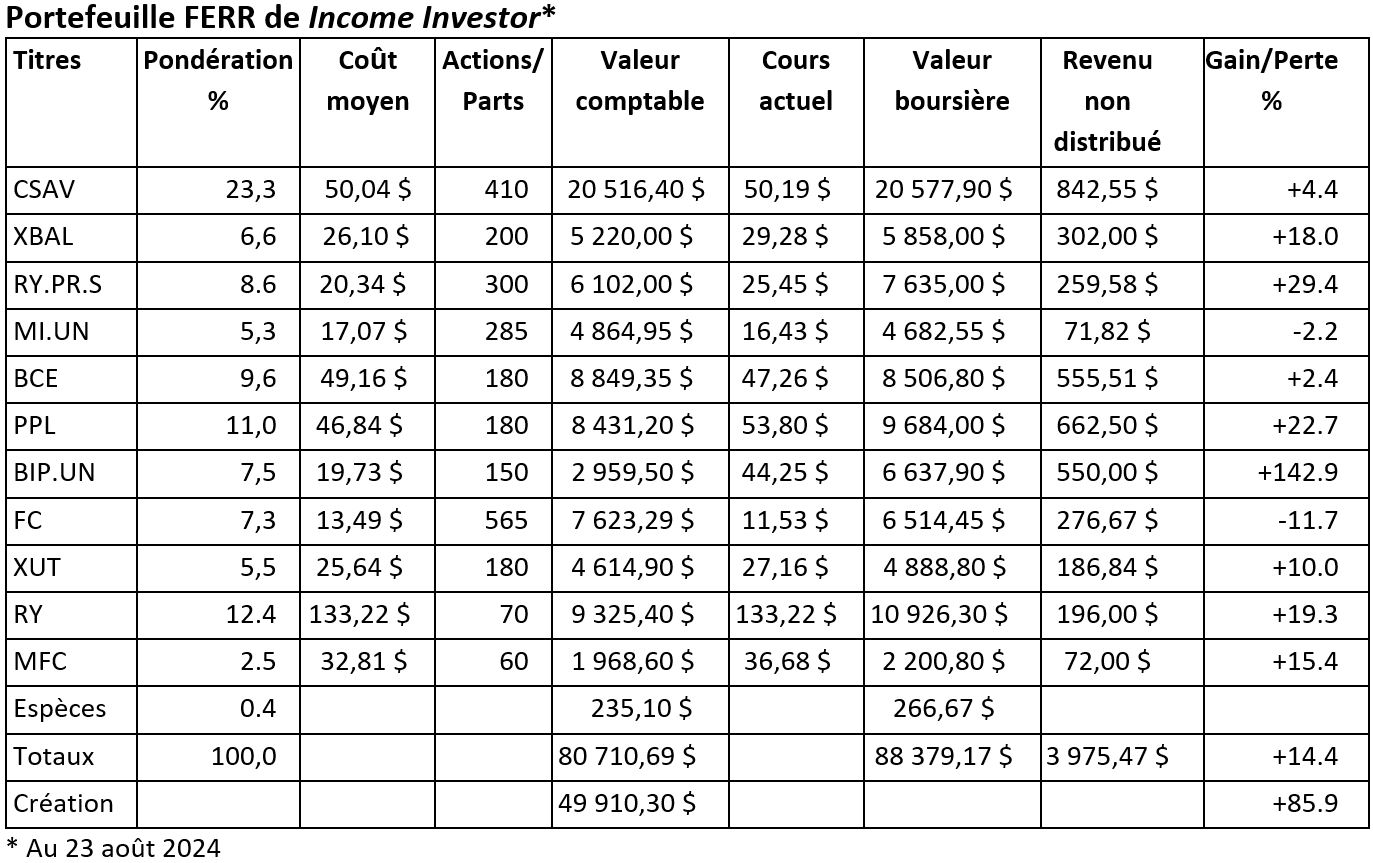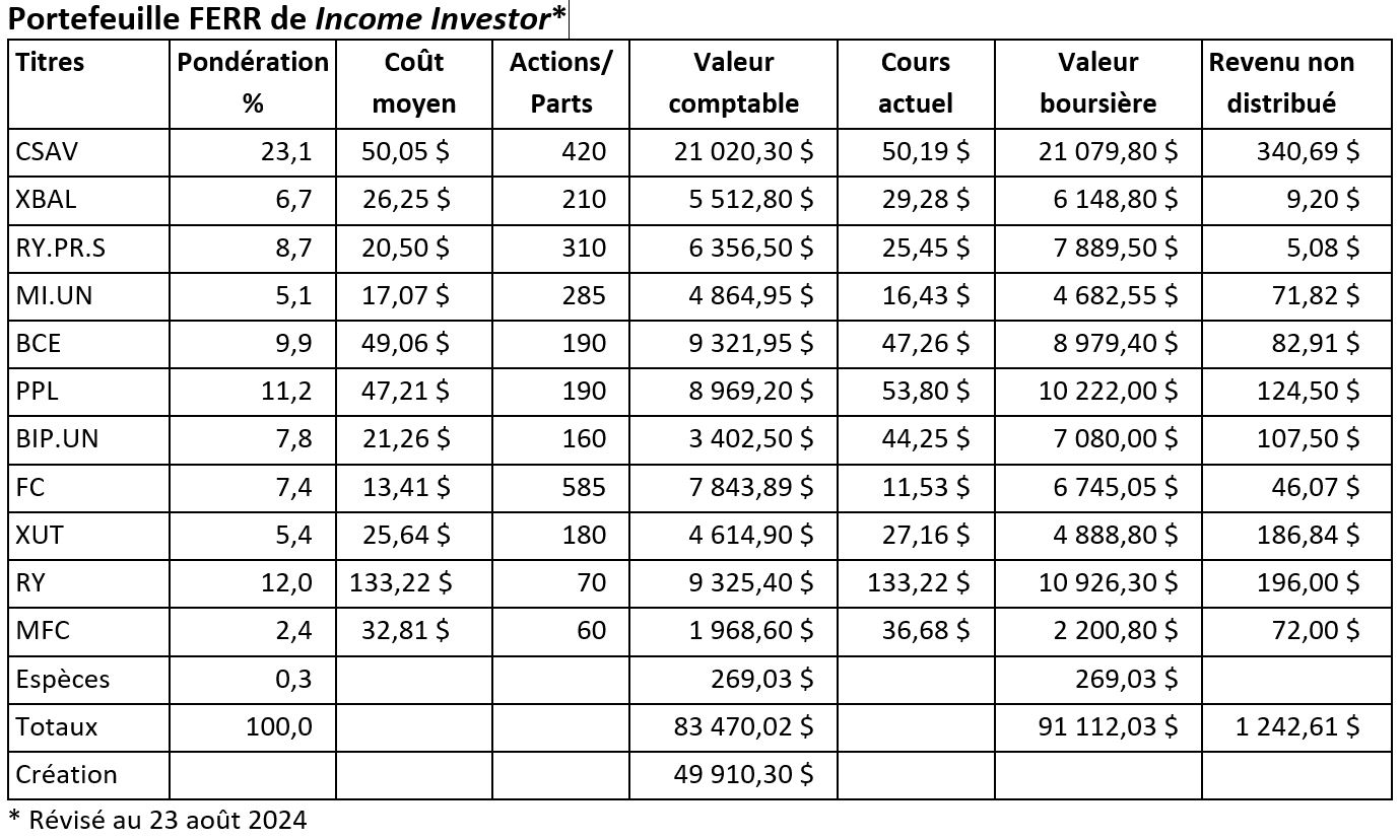 Voici un aperçu du portefeuille de FERR à la clôture des opérations le 23 août. Veuillez noter que les commissions ne sont pas déduites. Bien qu’il s’agisse d’un portefeuille de FERR, les retraits ne sont pas pris en compte, car il serait impossible de suivre le rendement avec exactitude.