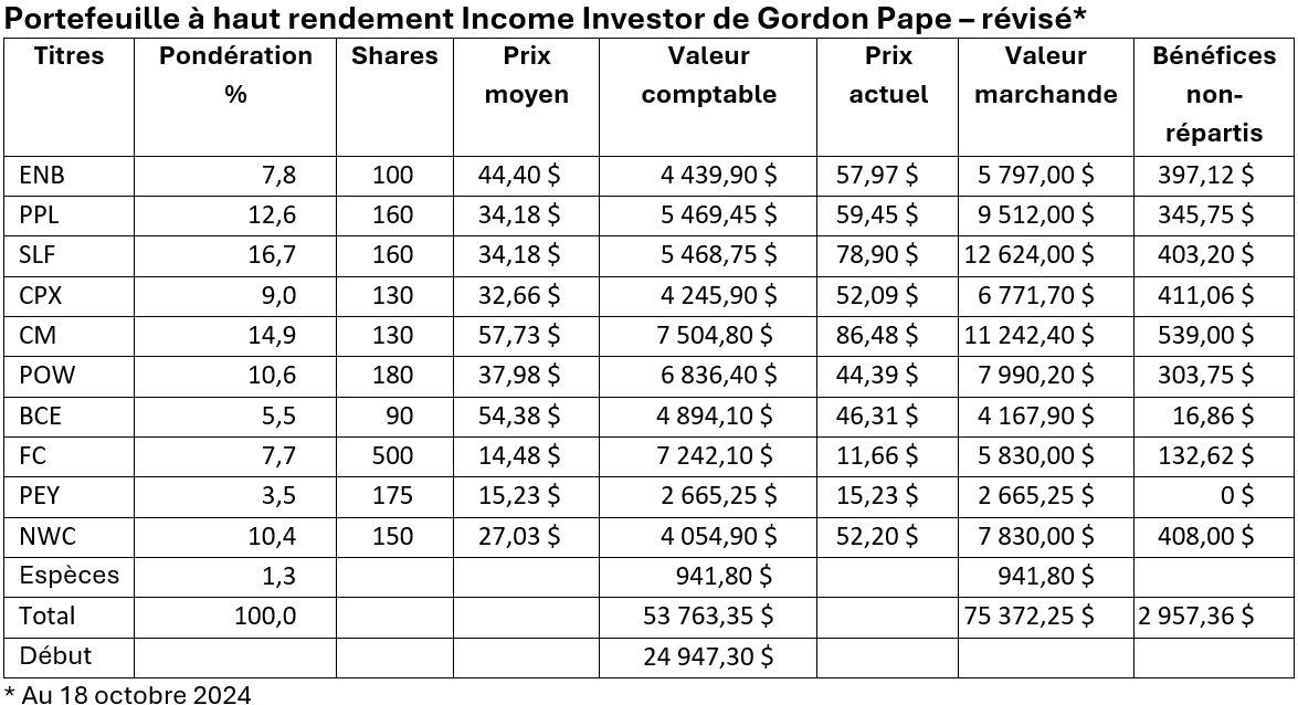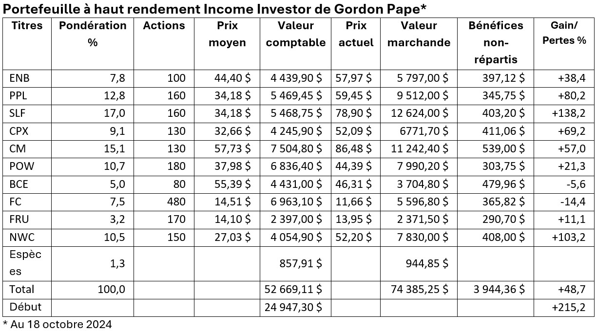 Contenu © 2024 par Gordon Pape Enterprises. Tous droits réservés. Reproduction autorisée. Ce qui précède est à des fins d’information générale uniquement et n’engage que l’opinion de l’auteur. Les titres mentionnés présentent un risque de perte et aucune garantie de performance n’est établie ou implicite. Ces informations ne visent pas à fournir des conseils personnalisés spécifiques, y compris, mais sans s’y limiter, des conseils en placement, financiers, juridiques, comptables ou fiscaux. Demandez toujours conseil à votre propre conseiller financier avant de prendre des décisions en matière d’investissement.