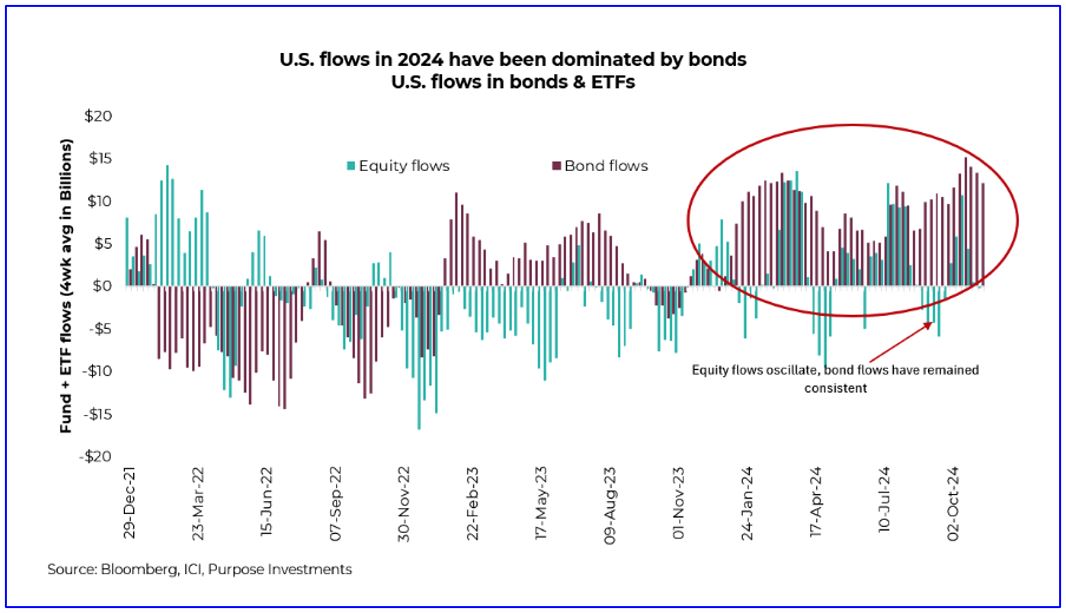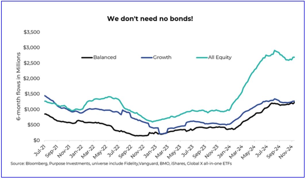 Les investisseurs se tournent massivement vers des solutions tout-en-un entièrement en actions, probablement dans une quête de performance. Ces véhicules, davantage destinés aux investisseurs autonomes, ne reflètent pas une tendance généralisée sur le marché. Cependant, leur orientation entièrement en actions pourrait poser des défis à mesure que l'euphorie post-électorale s'estompe, avec des sentiments et des positions déjà étendus.