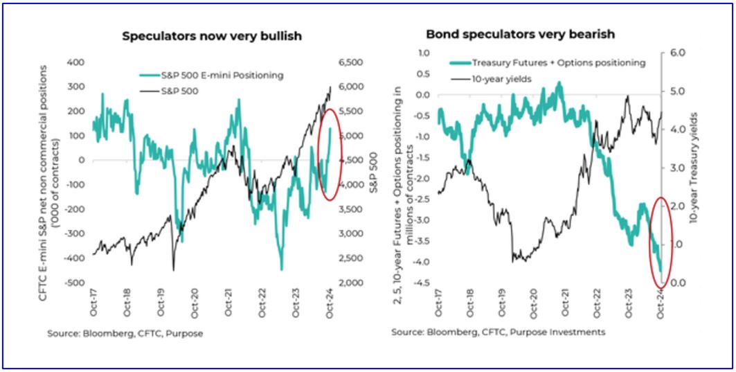 En examinant où se trouve l’argent, la situation est peut-être plus préoccupante. Au cours du dernier mois, la tendance a été à des positions plus haussières sur les actions et plus baissières sur les obligations, selon les marchés à terme et les options. Ces tendances semblent s’être accélérées après les résultats des élections – atteignant peut-être désormais des niveaux plutôt extrêmes ou prolongés.