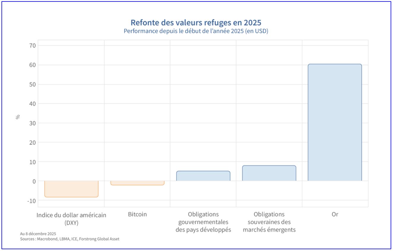 Une divergence marquée se manifeste également parmi les réserves de valeur alternatives. Les cryptomonnaies prospèrent sur la spéculation, reflétant une exposition élevée à la liquidité et au sentiment technologique. L’or, à l’inverse, prospère dans l’incertitude. Lent, stable et historiquement fiable lorsque les cadres politiques semblent perdre leurs repères, il retrouve un rôle central. À mesure que les ancrages monétaires s’affaiblissent et que les risques géopolitiques augmentent, l’or s’affirme de plus en plus comme une monnaie alternative et une couverture de portefeuille.