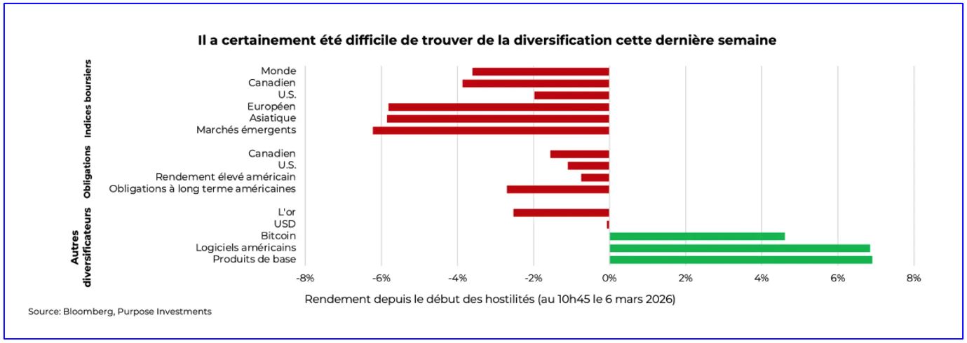 On pourrait penser que si les marchés se replient en raison d’une augmentation importante du risque géopolitique découlant du déclenchement de la guerre entre les États-Unis, Israël et l’Iran, l’or devrait être un bon facteur de diversification. Ce n’était manifestement pas le cas la semaine dernière. Les obligations ne se portent pas non plus. À la rescousse des portefeuilles se trouvent les bitcoins et les titres de logiciels; cela ne correspond certainement pas au scénario traditionnel. Et bien sûr, les matières premières sont en plein essor grâce à la forte hausse des prix du pétrole.
