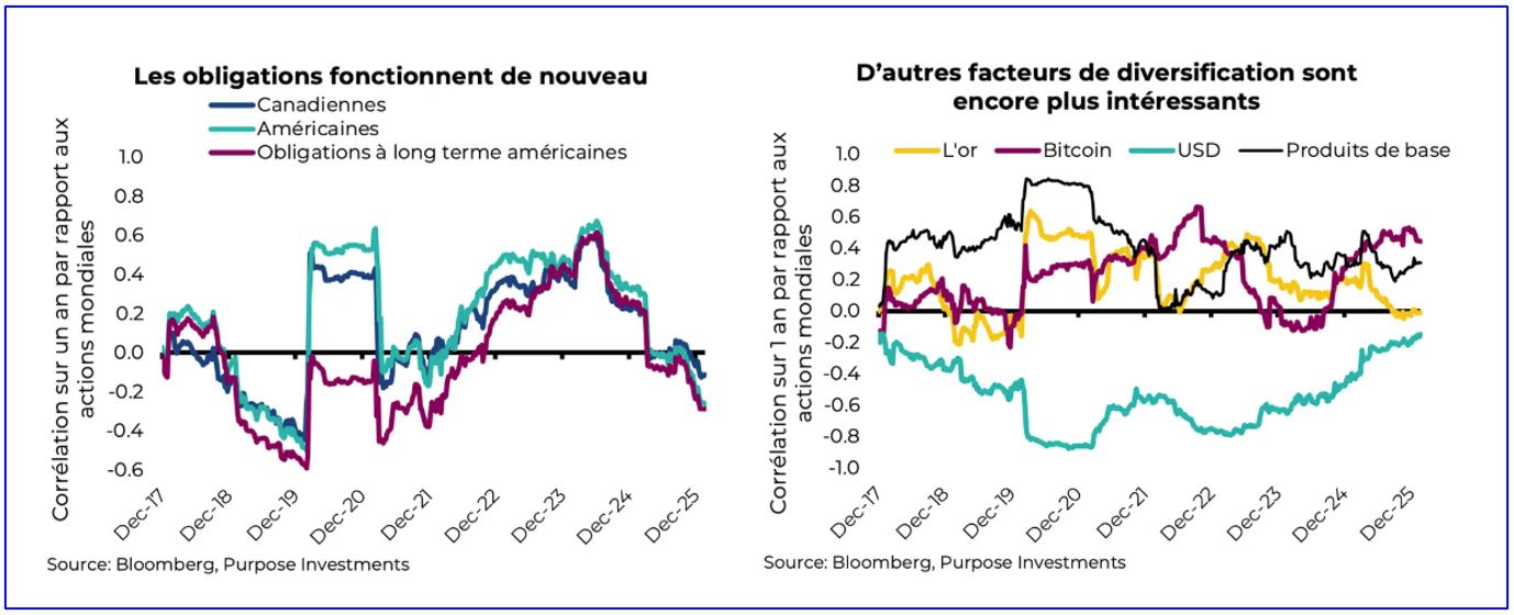 Les autres facteurs de diversification uniques sont peut-être encore plus intéressants. Pendant de nombreuses années, l’exposition au dollar américain a été une très bonne diversification pour les investisseurs canadiens. Du point de vue de la corrélation, cette proportion a diminué dernièrement. Le bitcoin, l’or et les marchandises présentent généralement des corrélations positives par rapport aux actions mondiales, mais elles sont certainement inférieures.