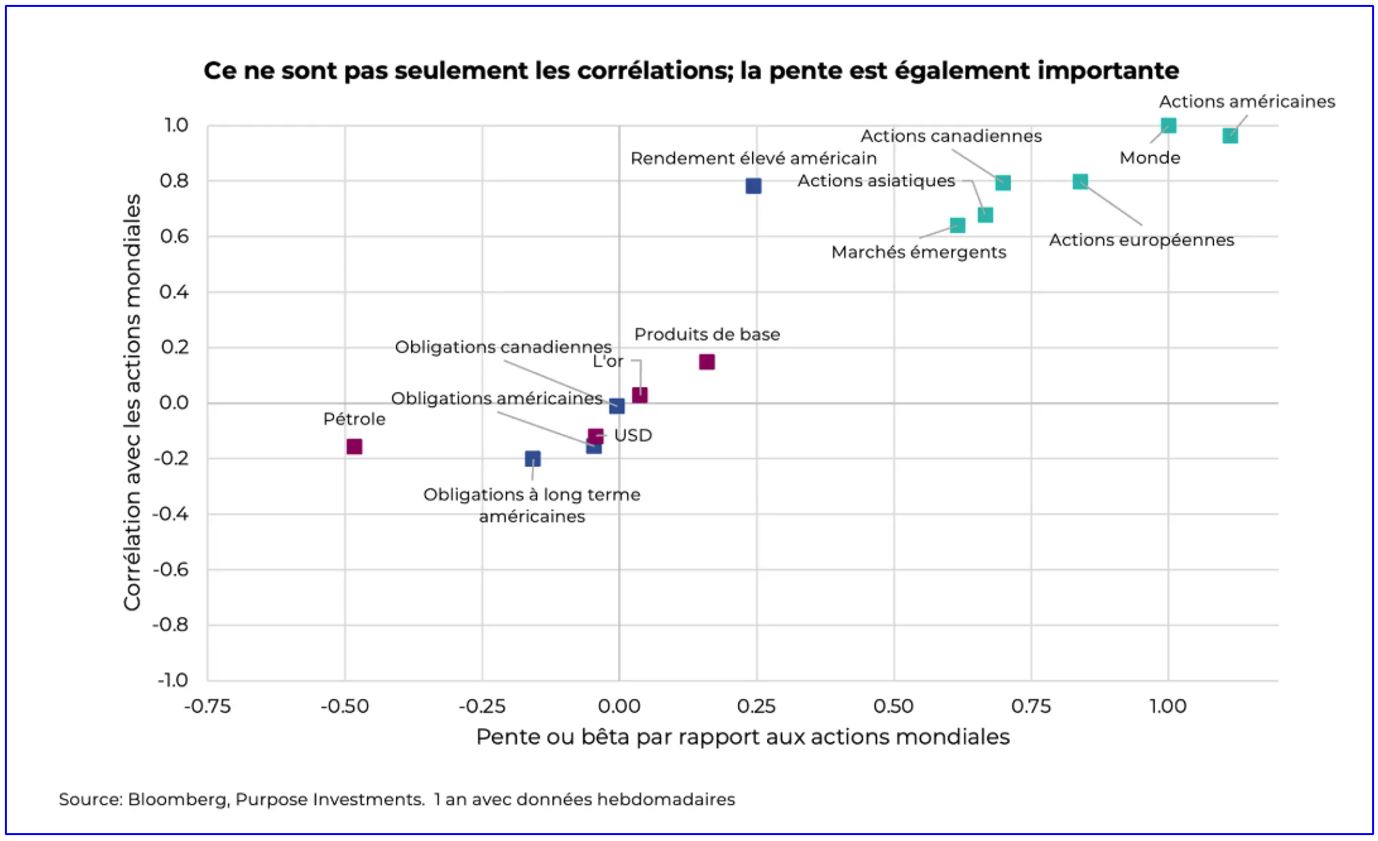 Les corrélations ne révèlent qu’une partie de l’histoire : la direction relative moyenne. L’autre aspect est le degré de la décision. Le graphique de dispersion suivant présente un panier de catégories d’actifs avec une corrélation avec les actions mondiales sur l’axe des y et une pente sur l’axe des x. Par exemple, les obligations américaines à rendement élevé sont fortement corrélées aux actions, mais la pente est beaucoup plus faible, ce qui signifie que l’orientation sera souvent la même, mais que les obligations à rendement élevé évolueront beaucoup moins. Cela favorise la diversification.