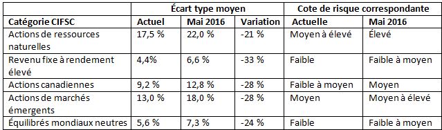 Depuis que l'ACVM a établi les fourchettes d'écart-type en 2016, l'ÉT moyen pour chaque catégorie établie par le comité canadien des standards des fonds d'investissement (CIFSC) a diminué. En fait, pour 18 des 34 catégories possédant un historique de 10 ans en mai 2016, l'écart-type du fonds moyen est descendu d'un cran. Par exemple, un fonds moyen d'actions de ressources naturelles est passé d'un écart type de 22 % (risque élevé) à 17,5 % (risque moyen à élevé) lors des trois dernières années. Le tableau ci-dessous nous montre dans quelle mesure les autres catégories ont été touchées.