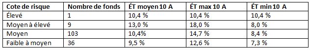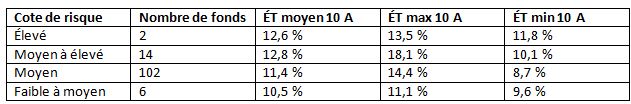 Certains gestionnaires augmentent les cotes de risque à leur discrétion, comme c'est le cas pour deux fonds à risque noté élevé, dont la volatilité équivaut à un risque moyen. Mais clairement, plusieurs gestionnaires n'en font pas de même, et ont simplement baissé leurs cotes selon les fourchettes d'ÉT. Par exemple neuf fonds dont le risque est classé Moyen possèdent un écart type sur 10 ans supérieur à la moyenne des fonds dont le risque est classé Élevé, dont la fourchette de risque se situe deux crans plus haut.