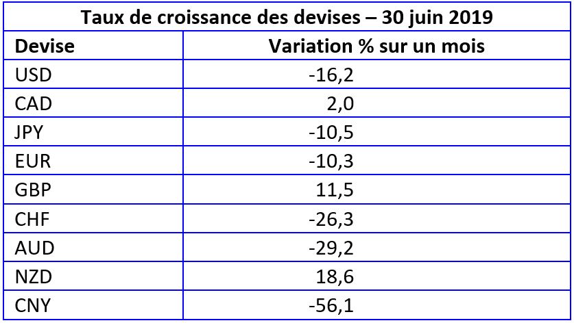 Le tableau ci-dessous illustre les taux de croissance d'un mois à l'autre pour les principales devises mondiales.