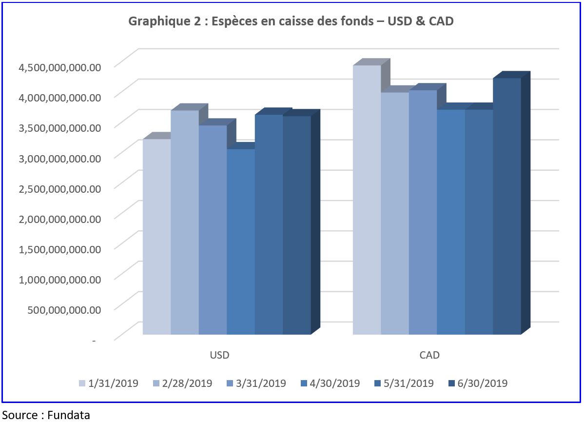Le Graphique 2 illustre la valeur moyenne des espèces en dollars, dans un ordre séquentiel d'avril 2019 à juin 2019. Le dollar américain avait une position nette de 3 596 782 139 $ en juin 2019. Le dollar canadien avait une position nette de 4 224 457 550 $ en juin 2019.