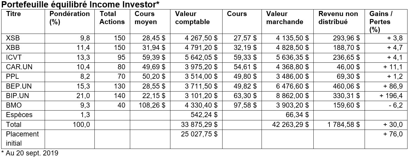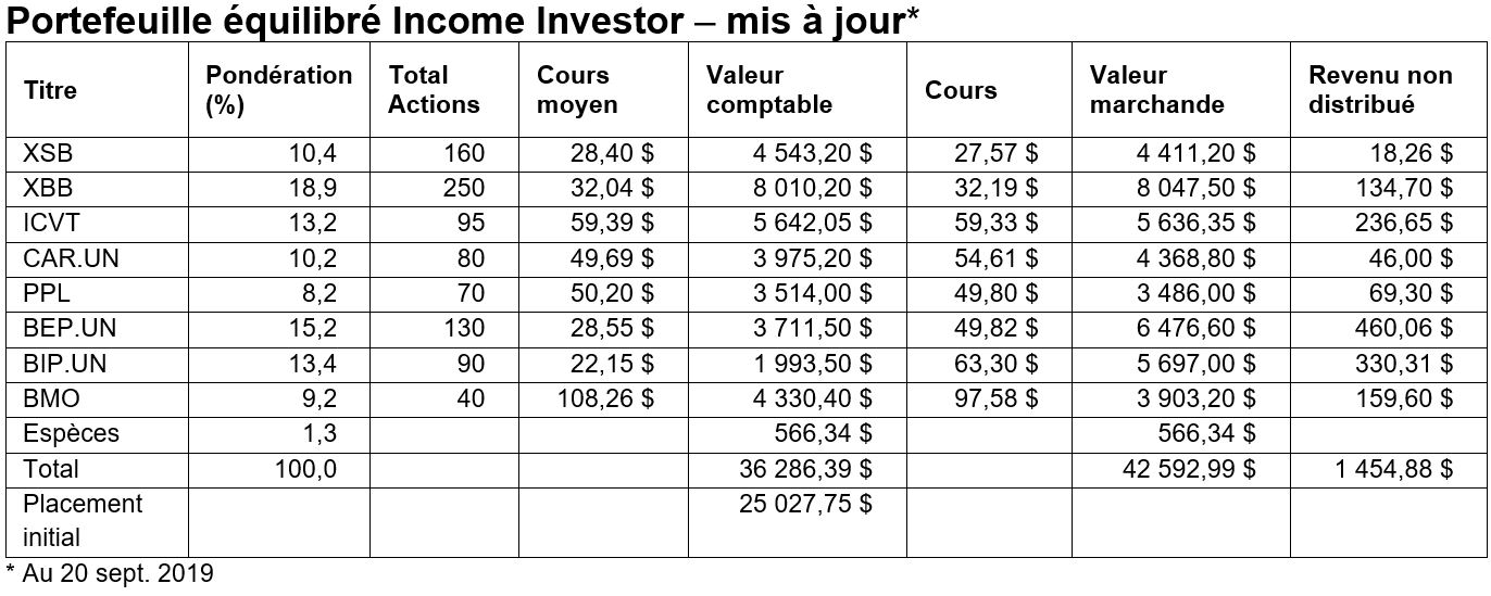 Voici l'état actuel du portefeuille. Les commissions ne sont pas prises en compte. Par souci de simplicité et pour les besoins du calcul, on considère les dollars canadiens et américains comme étant monnaies égales, bien qu'il soit évident que les dividendes reçus des deux sociétés en commandite Brookfield et ICVT valent davantage en termes de dollars canadiens.