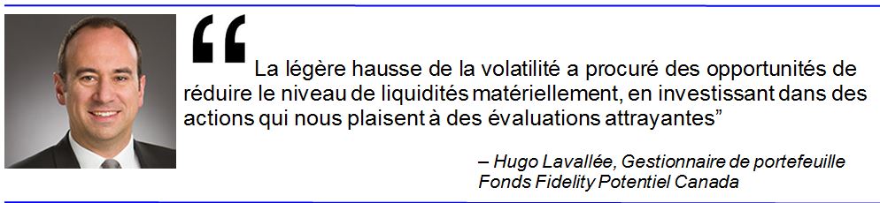 Plus récemment, cependant, le recul du marché mentionné par M. Lavallée, qui a vu l'Indice composé S&P/TSX chuter de presque 18 000 le 20 février à 14 270 à la clôture le 11 mars (une baisse de 20 %), a changé la donne de manière significative. « La légère hausse de la volatilité a procuré des opportunités de réduire le niveau de liquidités matériellement, en investissant dans des actions qui nous plaisent à des évaluations attrayantes », indique M. Lavallée. Il ajoute toutefois qu'à cause de la politique de divulgation de Fidelity, il ne peut dévoiler le pourcentage exact qui a été déployé ces derniers jours.