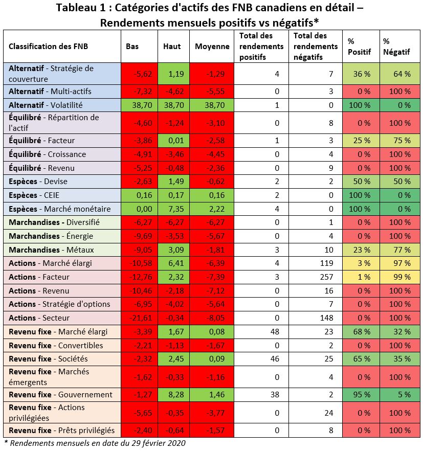 Le tableau 1 fait un examen approfondi des catégories d'actifs afin d'analyser les mandats d'investissement des FNB qui résistent efficacement à cette tempête. L'analyse inclut 842 FNB canadiens.