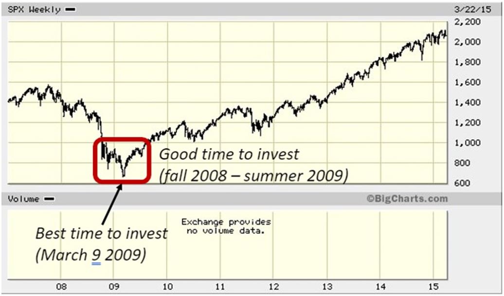Tel était le cas pendant la grande crise financière où nous avons constaté que la faiblesse des cours de l’indice S&P500 a duré pendant environ neuf mois (depuis l’automne 2008 jusqu’à l’été 2009) et où le meilleur moment d’investir était le 9 mars 2009 (voir le graphique).
