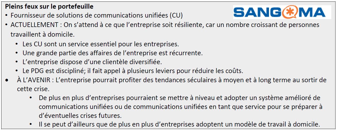 Technologie : Les entreprises du secteur des technologies sont souvent bien placées pour saisir les nouvelles occasions qui se présentent au sortir de périodes comme celle que nous traversons. Nous constatons déjà des changements importants sur le plan du comportement humain. L’économie du travail à domicile et les nouvelles habitudes des consommateurs accélèrent l’adoption de nouvelles technologies.