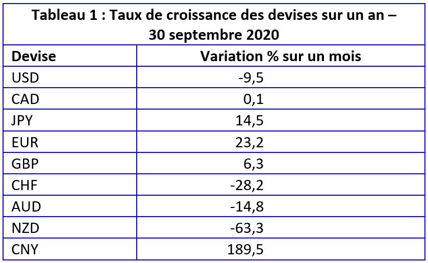 Le tableau 1 ci-dessous illustre les taux de croissance d'un mois à l'autre pour les principales devises mondiales.