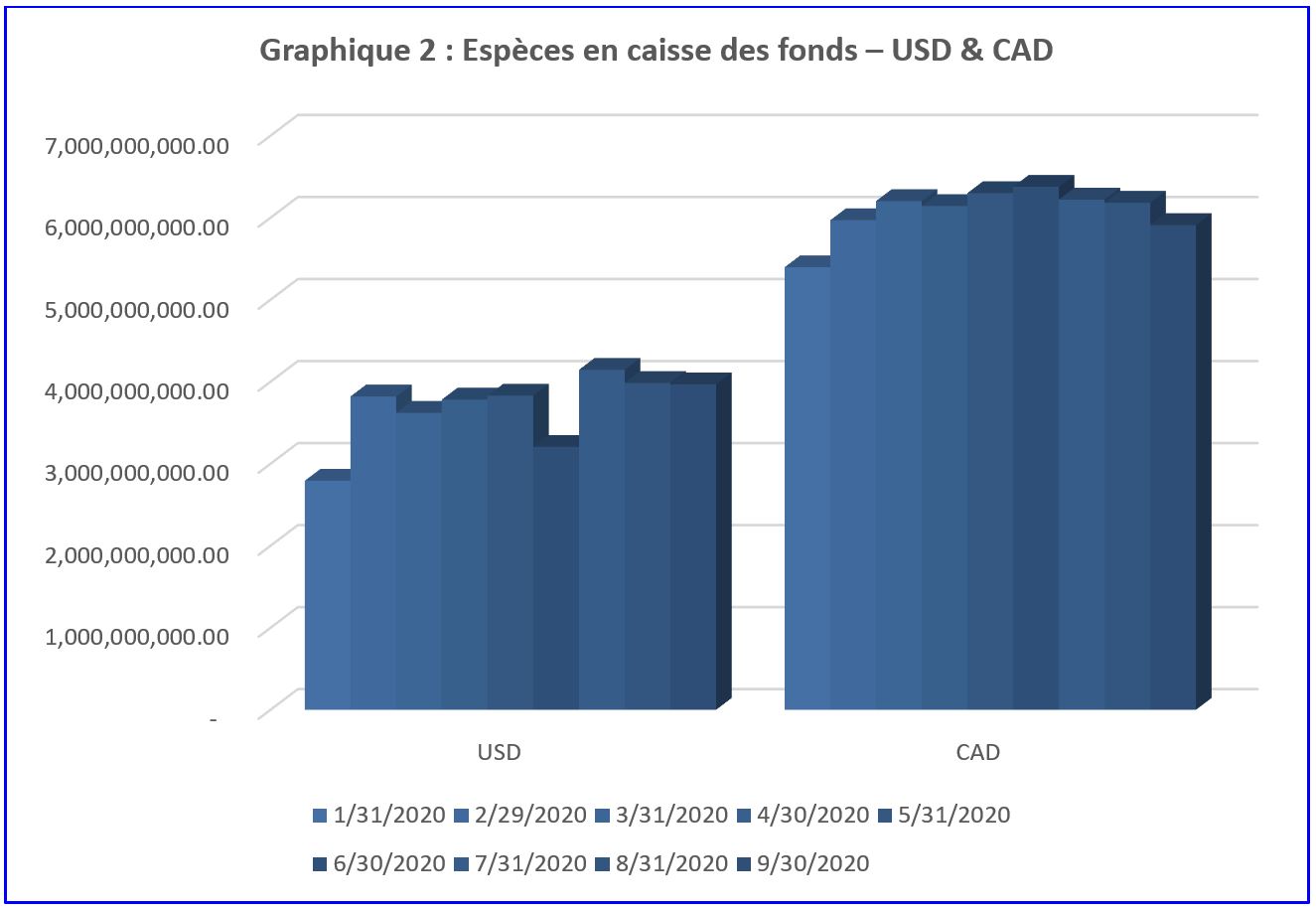 Le Graphique 2 illustre la valeur moyenne des espèces en dollars, dans un ordre séquentiel de janvier 2020 à septembre 2020. Le dollar américain avait une position nette de 3 968 401 511 $ en septembre 2020. Le dollar canadien avait une position nette de 5 910 109 706 $ en septembre 2020.