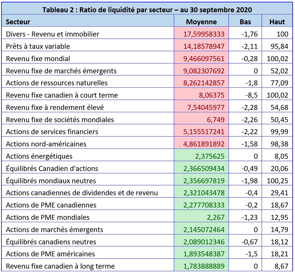 Le ratio de liquidité des fonds de placement est calculé comme étant le montant de la trésorerie d'un fonds par rapport à la totalité de ses actifs. Il est important de déterminer ce ratio lors de l'analyse des placements et de la répartition du capital. Il a le pouvoir de donner des informations détaillées sur le flux de capital global vers des secteurs verticaux spécifiques, et sur le sentiment haussier ou baissier dans ces catégories de placement. Le tableau 2 liste les 10 meilleures et pires catégories des secteurs applicables selon le ratio moyen de plus de 3 000 fonds de placement détenant un mandat pour investir dans les secteurs concernés. Le tableau présente les secteurs les plus baissiers et les plus haussiers par ordre décroissant.