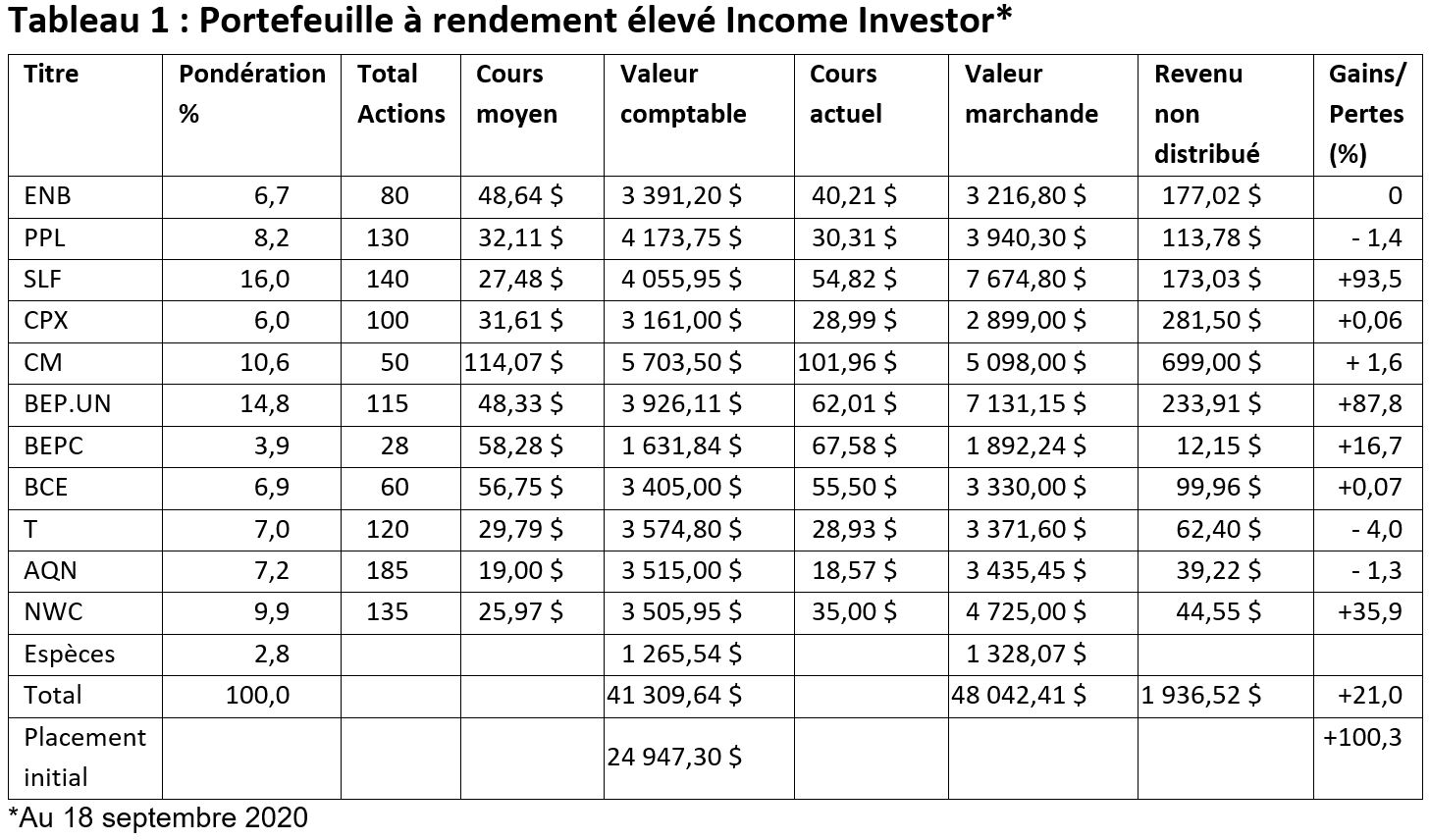 Le tableau 1 montre ce à quoi le portefeuille ressemblait à la clôture des négociations le 18 septembre. La pondération est le pourcentage de la valeur marchande du titre par rapport à la valeur marchande totale du portefeuille. Les gains/pertes montrent la performance du titre depuis son lancement ou depuis son ajout au portefeuille. Les commissions de vente et les taux de change ne sont pas pris en considération.