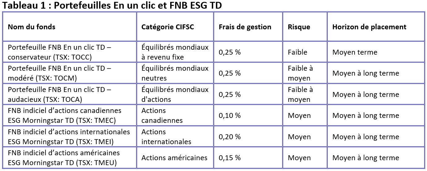Le tableau 1 présente quelques informations clés sur les portefeuilles des FNB TD En un clic et les FNB TD ESG.