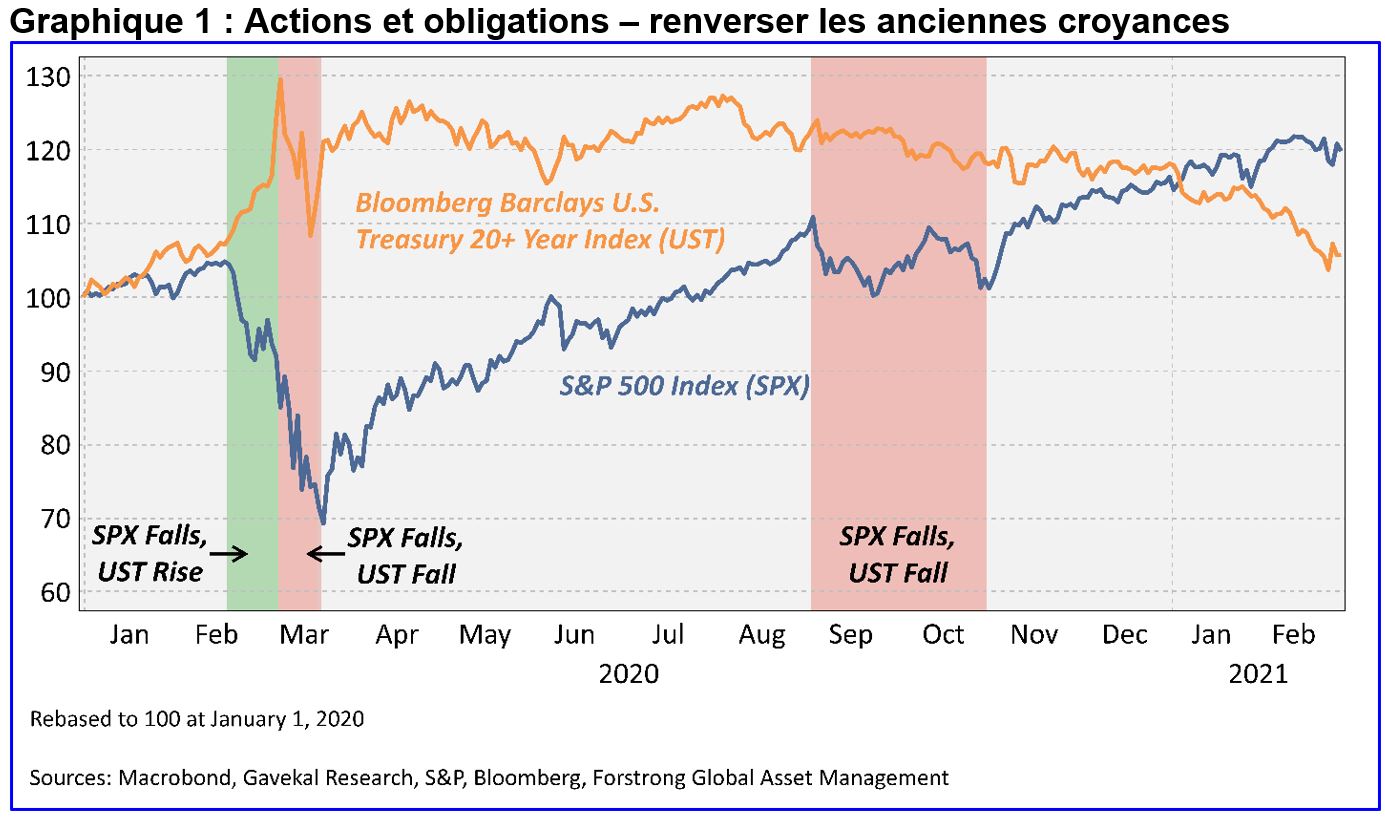 On sait par contre une chose : pour les marchés des capitaux, la victime la plus manifeste de la crise du coronavirus – et celle qui en dit le plus – est le marché obligataire. Pendant 40 ans, les obligations ont produit des rendements positifs quand les marchés boursiers faisaient marche arrière. À l’évidence, ce ne fut pas le cas en 2020. En début d’année, les obligations ont bien connu une reprise alors que la réalité du coronavirus s’imposait dans nos vies. Mais dès la mi-mars, les obligations étaient liquidées au même titre que les actions. Puis, quand les actions ont de nouveau piqué du nez en septembre et en octobre 2020, les obligations ont vite plongé à leur suite.