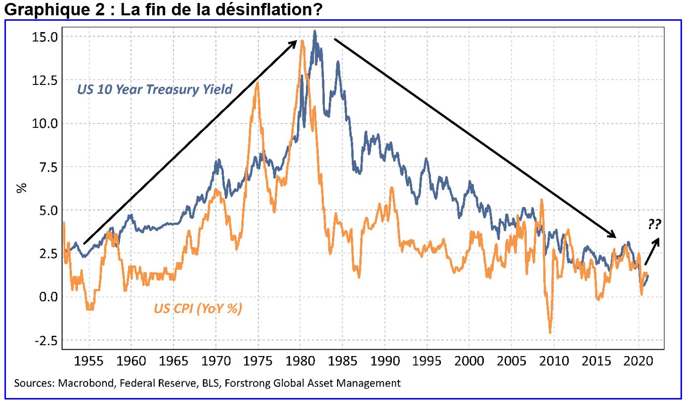 Dans le monde de l’élaboration de la politique budgétaire, la pandémie aura marqué une franche rupture. Les mesures de relance budgétaires sont arrivées aussi vite qu’énergiquement. Beaucoup prévoient néanmoins des programmes de dépenses budgétaires supplémentaires, qui vont des baisses d’impôts aux programmes d’infrastructures, en passant par des initiatives pour sortir toujours plus le monde de sa dépendance au carbone. Tout cela est sous-tendu par la théorie monétaire moderne (à ce sujet : https://forstrong.com/ask-forstrong/ask-forstrong-modernmonetary-theory-the-bar-is-finally-open/). Chose importante, une idée fait maintenant consensus parmi les décideurs, celle selon laquelle en faire trop peu serait beaucoup plus risqué que d’en faire trop. Le temps de l’austérité et de la dénonciation des déficits est révolu.