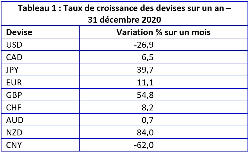 Le tableau 1 ci-dessous illustre les taux de croissance d'un mois à l'autre pour les principales devises mondiales.