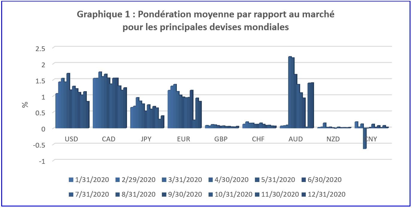 Le Graphique 1 illustre le pourcentage moyen d'espèces dans les fonds de placement pour neuf devises principales, dans un ordre séquentiel de janvier 2020 à décembre 2020.