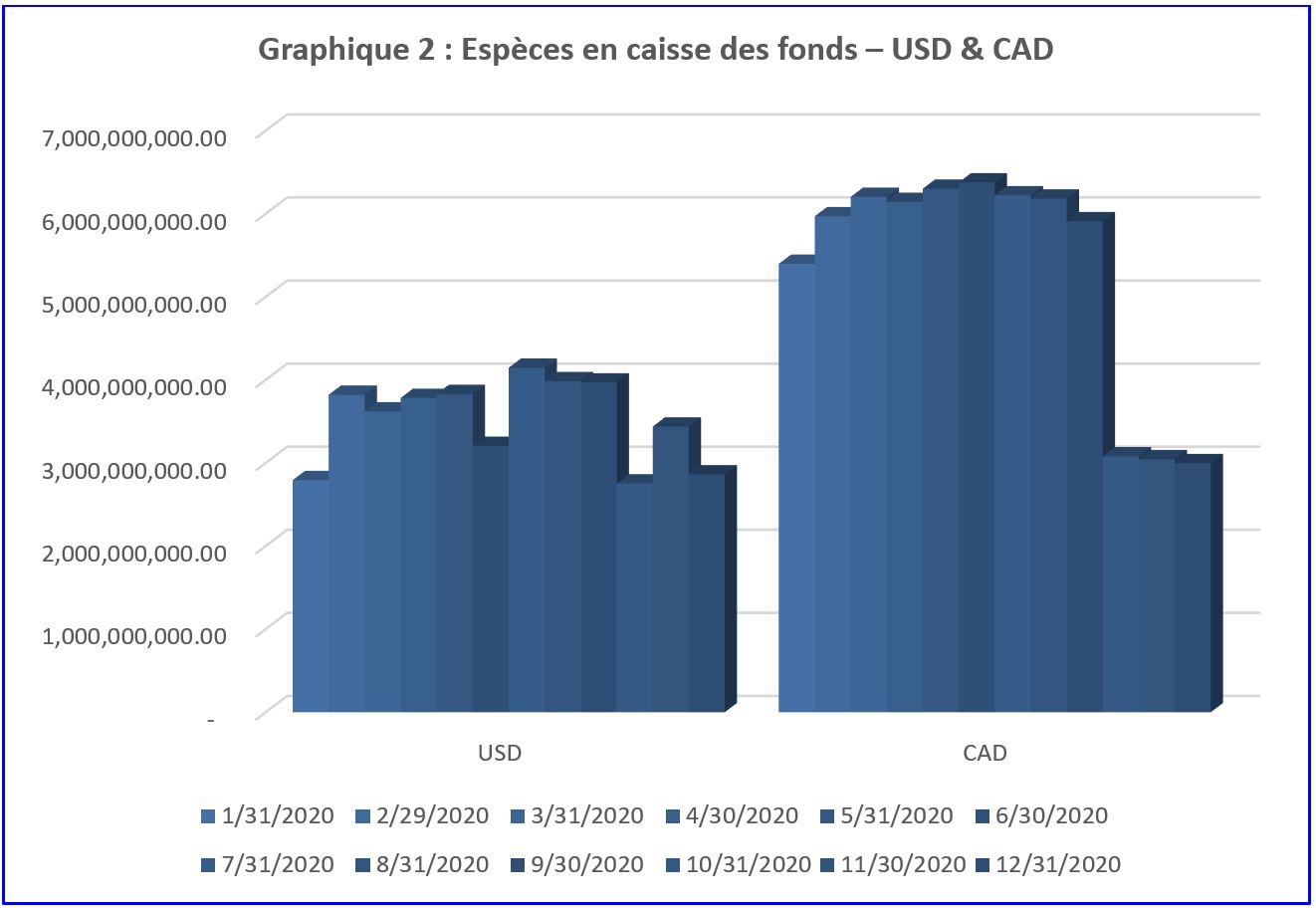 Le graphique suivant illustre la valeur moyenne des espèces en dollars, dans un ordre séquentiel de janvier 2020 à décembre 2020. Le dollar américain avait une position nette de 2 862 738 151 $ en décembre 2020. Le dollar canadien avait une position nette de 2 997 585 436 $ en décembre 2020.