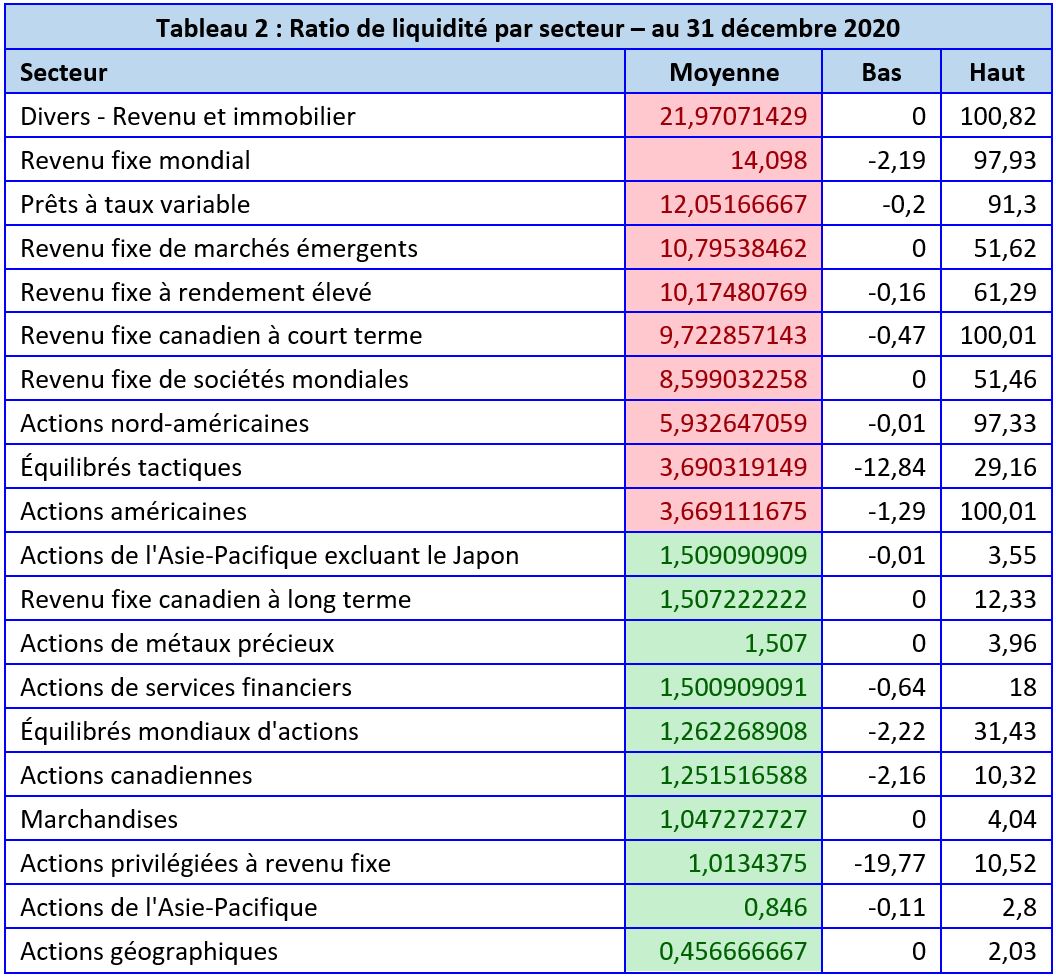 Le ratio de liquidité des fonds de placement est calculé comme étant le montant de la trésorerie d'un fonds par rapport à la totalité de ses actifs. Il est important de déterminer ce ratio lors de l'analyse des placements et de la répartition du capital. Il a le pouvoir de donner d'incroyables informations sur le flux de capital global vers des secteurs verticaux spécifiques, et sur le sentiment haussier ou baissier dans ces catégories de placement. Le tableau 2 liste les 10 meilleures et pires catégories des secteurs applicables selon le ratio moyen de plus de 3 000 fonds de placement détenant un mandat pour investir dans les secteurs concernés. Le tableau présente les secteurs les plus baissiers et les plus haussiers par ordre décroissant.