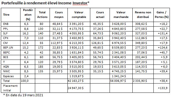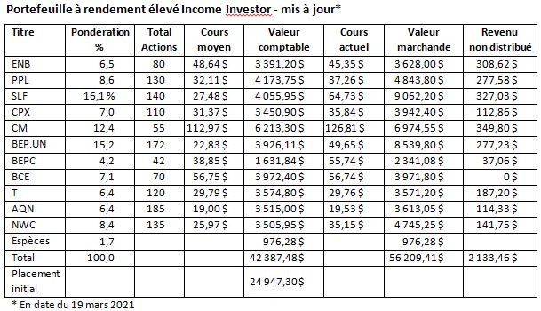 Commentaires : Le portefeuille se porte bien, ayant gagné 16,7 % au cours de la dernière période d'examen. Tous les titres du portefeuille ont gagné du terrain, les contributions les plus importantes provenant de la CIBC et de la Sun Life.
