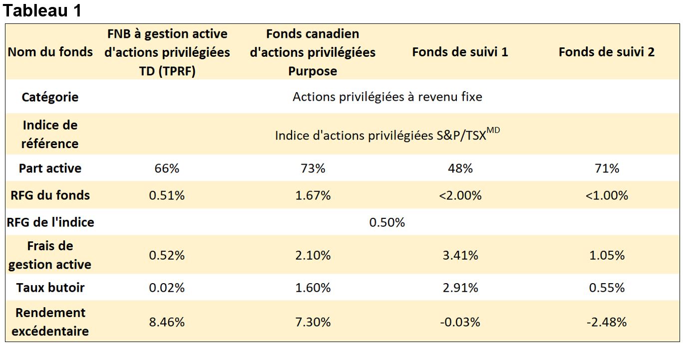 Cet indice, qui est l'un des plus reconnus pour représenter le vaste marché des fonds privilégiés canadiens, sert de référence à de nombreux fonds de cette catégorie, dont les quatre que nous allons examiner ici. Ce sont tous des fonds privilégiés canadiens gérés activement. Deux d'entre eux sont les plus performants sur la période, et deux sont à la traîne par rapport aux autres fonds de leur catégorie.