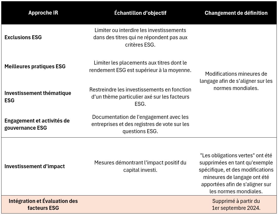 Un résumé de chaque approche d’investissement responsable et des modifications qui y ont été apportées est présenté dans le tableau ci-joint.
