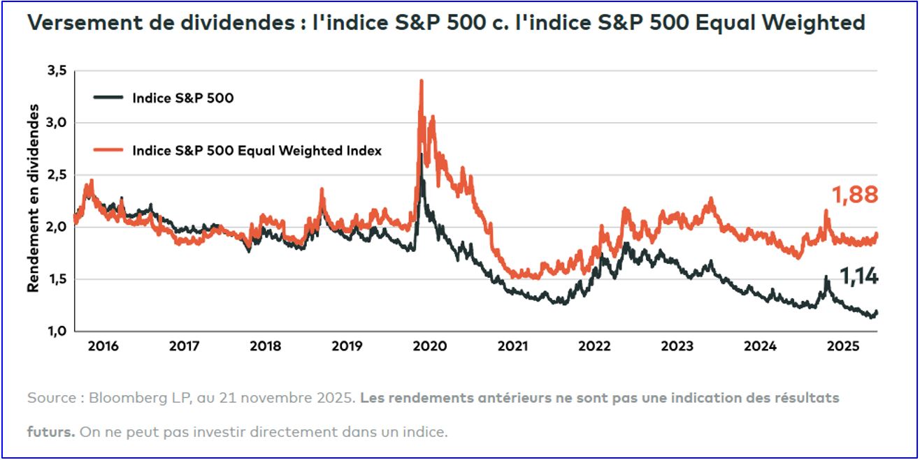 D’ailleurs, ce n’est pas forcément une mauvaise chose, surtout pour les investisseurs axés sur les dividendes qui sont prêts à regarder sous la surface et à chercher activement des occasions. Compte tenu de l’étroitesse persistante des rendements boursiers en 2025, de nombreux secteurs oubliés du marché n’ont pas participé pleinement à la remontée et continuent de produire des rendements relativement élevés. En fait, l’indice S&P 500 Equal Weighted (équipondéré) le confirme : son rendement en dividendes est nettement supérieur à celui de l’indice S&P 500, précisément parce qu’une pondération supérieure est allouée à certains des titres à rendement élevé qui ont été délaissés par le marché haussier.