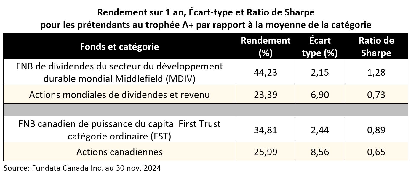 Un autre solide candidat pour la première fois à un Trophée FundGrade A + dans la catégorie Actions canadiennes est le FNB canadien de puissance du capital First Trust (TSX : FST). Le fonds a généré un rendement sur 1 an de près de 35 % jusqu’en novembre, jumelé à un faible écart-type de 2,44 %. Son ratio de Sharpe sur 1 an de 0,89 a nettement surperformé le ratio de Sharpe moyen de la catégorie de 0,65, en grande partie en raison de la volatilité beaucoup plus élevée de la catégorie de 8,6%.