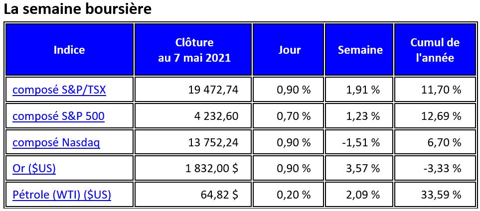 L'indice composé S&P 500 a clôturé à un nouveau record vendredi, progressant de 1,2 % sur la semaine. L'indice composé Nasdaq est resté à la traîne, reculant de 1,5 % sur la semaine, les investisseurs continuant à délaisser les valeurs de croissance (les valeurs technologiques étant les plus touchées) au profit de secteurs axés sur la valeur et considérés comme bénéficiant de la reprise économique, tels que les valeurs industrielles, les matériaux, l'énergie, les valeurs financières et les transports. L'indice composé S&P/TSX de Toronto a également bénéficié de cette tendance, gagnant près de 2 % sur la semaine, les secteurs de l'énergie et de la finance, poids lourds du TSX, ayant affiché de fortes progressions sur la semaine. Le pétrole brut a gagné 2,1 % sur la semaine, tandis que l'or a bondi de 3,6 %.