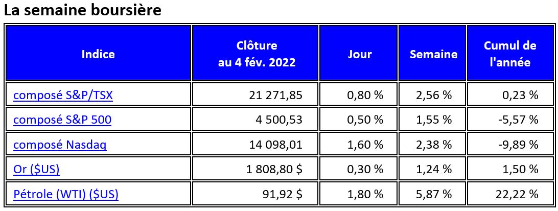 Les indices boursiers nord-américains ont affiché des gains solides au cours de la semaine, poursuivant la reprise qui a permis de récupérer les pertes subies en janvier. La force motrice de ce revirement de sentiment a été la création de 467 000 emplois aux États-Unis en janvier, alors que le taux de chômage a augmenté d'un cran, passant de 3,9 % en décembre à 4,0 %. Au Canada, le marché du travail a perdu 200 000 emplois en janvier, principalement dans le secteur des services où les restrictions et les mandats gouvernementaux ont forcé la fermeture de dizaines de milliers d'entreprises, mettant des centaines de milliers d'employés au chômage. Avec la levée des restrictions, les analystes estiment que la perte d'emplois était temporaire et s'attendent à une reprise du marché du travail, ainsi qu'à une baisse du taux de chômage par rapport au taux de 6,5 % enregistré en janvier.