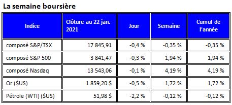 Au Canada, l'indice de référence S&P/TSX a affiché une performance nulle cette semaine, alors que le décret du président Joe Biden annulant le permis pour le pipeline Keystone XL de la frontière canadienne au Nebraska a eu des répercussions sur le secteur de l'énergie. L'indice plafonné de l'énergie S&P/TSX a pesé sur la performance globale de l'indice, en recul de 3,3 % sur la semaine. Le pétrole brut (en baisse de 0,1 % sur la semaine) et l'or (en hausse de 1,7 %) ont eu peu d'impact sur l'indice de référence du Canada, fortement pondéré en ressources.