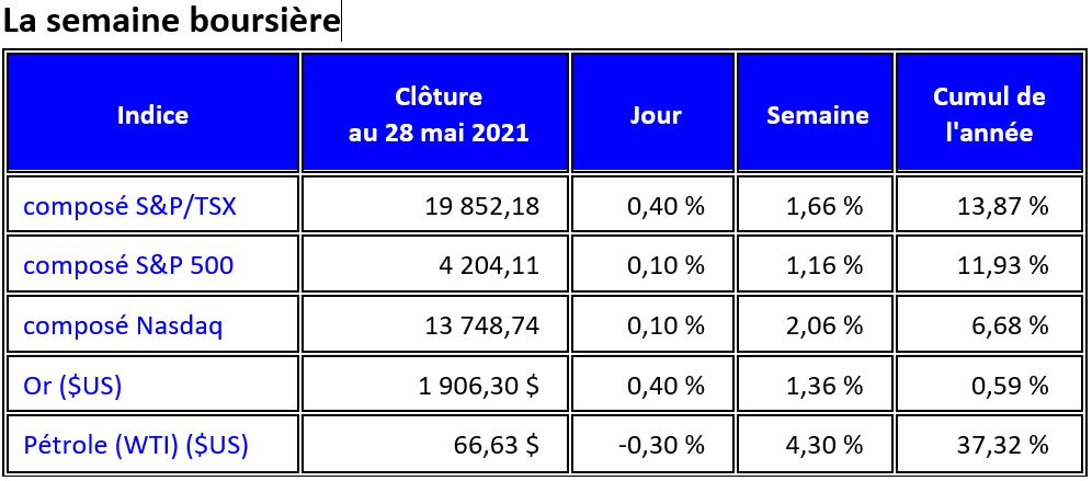 Les principaux indices boursiers nord-américains ont progressé au cours de la semaine, terminant à des niveaux records ou presque. Les investisseurs ont digéré les nouvelles données sur l'inflation, l’indice des prix à la consommation PCE (Personal Consumption Expenditure) aux États-Unis s'étant établi à 3,6 %, son plus haut niveau depuis 2008. L'indice des prix de base a augmenté de 3,1 %, son plus haut niveau depuis 1992. Parallèlement, la lecture finale de l'indice de confiance des consommateurs de l'Université du Michigan a été affichée à 82,9, en baisse par rapport à 88,3 en avril, ce qui suggère que la hausse des prix devient un facteur dans les décisions de dépenses des consommateurs. Les investisseurs ont également tenu compte du budget de 6 000 milliards de dollars US présenté vendredi par le président américain Joe Biden, qui prévoit un déficit de 1 800 milliards de dollars l'an prochain.