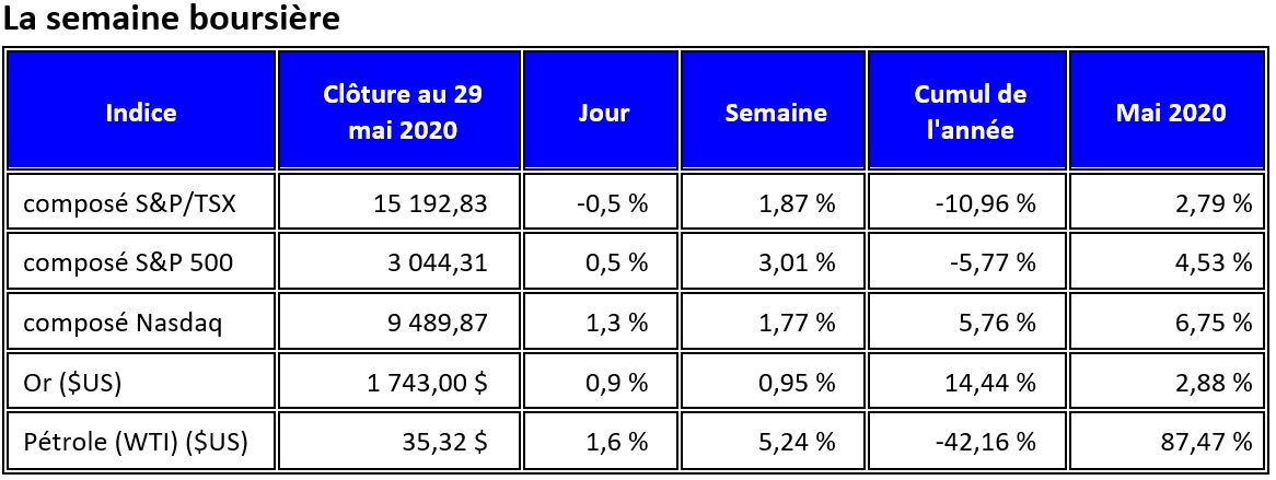 Lors d'une estimation provisoire vendredi, Statistique Canada a rapporté que le produit intérieur brut du Canada a baissé de 11 % en mars. Après un déclin du PIB de 7,2 % en mars, le PIB du premier trimestre s'est contracté à un taux annualisé de 8,2 %, soit le plus gros déclin depuis le premier trimestre de 2009, lors de la crise financière. L'indice composé S&P/TSX, indice de référence de Toronto, a gagné 1,9 % sur la semaine, et a affiché un progrès de 2,8 % sur le mois, aidé du secteur énergétique qui a été encouragé par une hausse de 87,5 % du cours du pétrole brut West Texas Intermediate en mai.