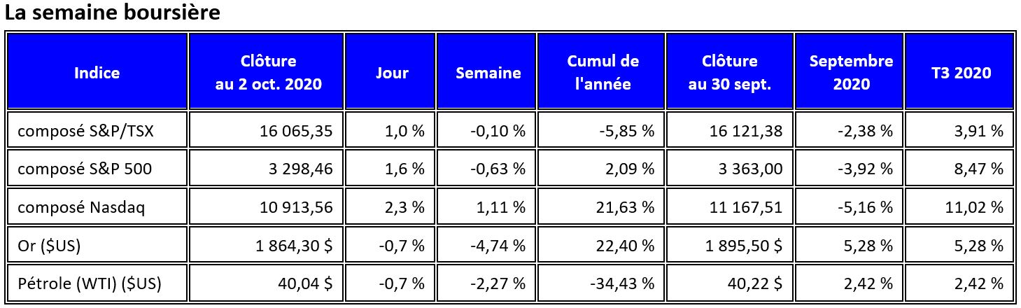 Le produit intérieur brut du Canada a augmenté de 3 % en juillet, les 20 secteurs industriels ayant tous progressé. L'estimation éclair du mois d'août indiquait une croissance de 1 % du PIB. En glissement annuel, le PIB affiche toujours une contraction de 5,0 %. L'indice de référence des actions canadiennes, l'indice composé S&P/TSX, a gagné 0,1 % lors de la séance de vendredi, mais a enregistré une baisse marginale de 0,1 % pour l'ensemble de la semaine, le prix du pétrole brut ayant chuté de 7,6 % pendant la semaine, tandis que l'or a augmenté de 2,2 %.