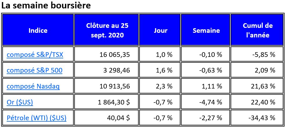 À l'exception de l'indice composé Nasdaq, qui a gagné 1 % sur la semaine, les principaux indices boursiers nord-américains ont affiché des pertes pour la quatrième semaine consécutive. La saison traditionnelle de la volatilité des marchés se répète cette année, alors que les investisseurs s'inquiètent de l'impasse dans laquelle se trouve la relance économique à Washington, du nombre croissant de cas de Covid-19 au Canada et aux États-Unis, de l'élection présidentielle américaine controversée qui aura lieu dans un peu plus d'un mois, et de l'avenir incertain du gouvernement fédéral minoritaire du Canada qui se prépare à présenter un budget de dépenses très élevé. L'indice de volatilité du CBOE (VIX) s'est établi à 30 à la fin de la semaine, ce qui est supérieur à la valeur habituelle de 20 dans des conditions de marché plus normales.