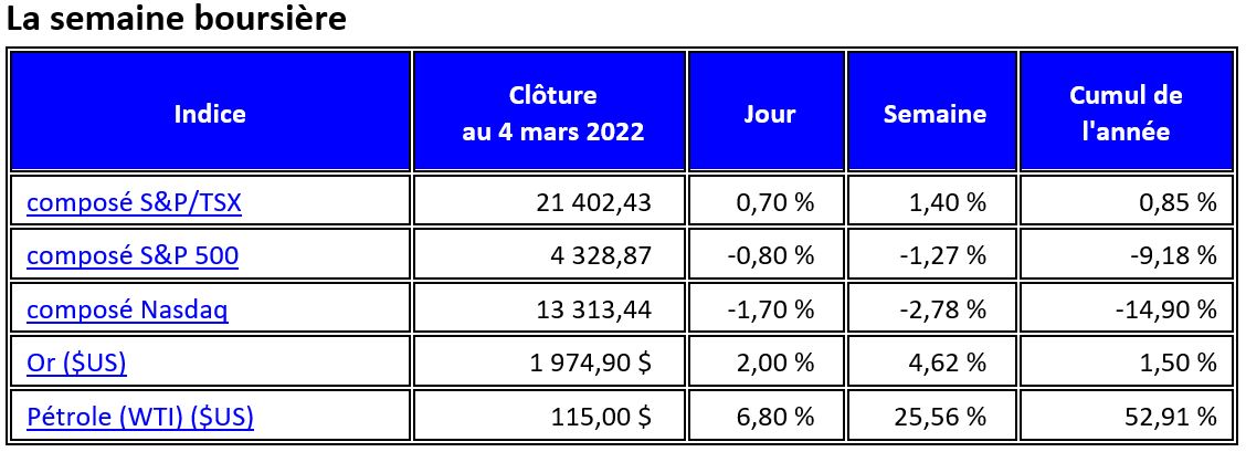 Les principaux indices boursiers américains ont de nouveau perdu du terrain au cours de la semaine, alors qu'une inflation élevée (à un taux annuel de 7,5 % en janvier), et la promesse du président de la Réserve fédérale américaine Jay Powell que des hausses de taux sont à venir, ont mis une pression de vente sur les actions, soutenue par les incertitudes macroéconomiques instiguées par l'invasion de l'Ukraine par la Russie. Bien que les actions de l'énergie et des services publics aient gagné du terrain avec les diverses sanctions et embargos enrayant une grande partie des exportations énergétiques russes, cela n'a pas été suffisant pour compenser les lourdes chutes des secteurs financier et bancaire des États-Unis. Même la création de 678 000 emplois en février n'a pas permis d'améliorer le sentiment du marché. Par conséquent, l'indice composé S&P 500 a perdu 1,3 % sur la semaine, et l'indice composé Nasdaq, pondéré de sociétés technologiques, a reculé de 2,8 %.