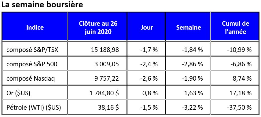 Les indices boursiers nord-américains ont clôturé à la baisse cette semaine, les investisseurs ayant fui les actifs à risque sur fond de résurgence de cas de COVID-19 dans plusieurs États américains, dont le Texas et la Floride, où les gouvernements ont commencé à revenir sur le récent assouplissement de certaines restrictions imposées aux entreprises. La crainte d'un arrêt de la reprise économique naissante, alors que les consommateurs perdent à nouveau confiance, a poussé les investisseurs à repenser et à réviser à la baisse les perspectives de bénéfices des entreprises à court terme.