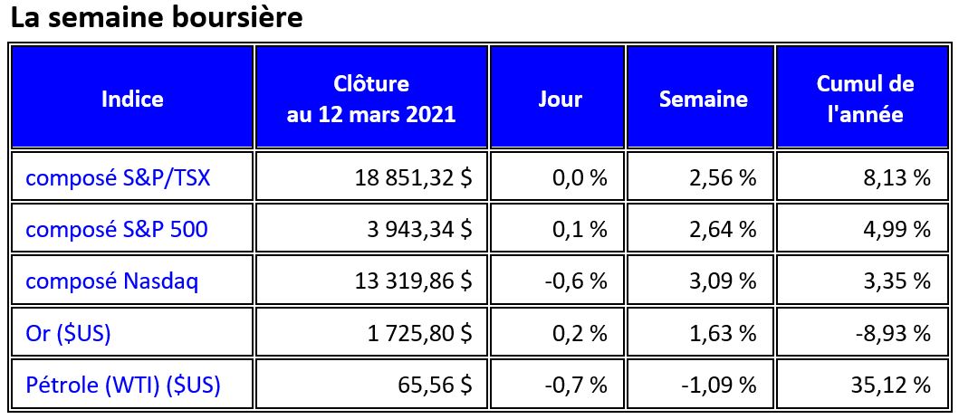 Avec une forte reprise économique attendue cette année, et la perspective d'un maintien de l'accommodation monétaire et des taux bas au moins jusqu'à la fin de 2022, les investisseurs avaient des raisons d'être optimistes pour le marché canadien. Le gain de 259 000 nouveaux emplois en février, alors que le taux de chômage est passé de 9,4 % en janvier à 8,2 %, a encore renforcé ce sentiment. La faiblesse du dollar américain a également contribué aux gains, alors qu'une hausse hebdomadaire de 9,2 % de l'indice des soins de santé S&P/TSX a mené à des gains généraux de l'indice composé S&P/TSX, qui a terminé la semaine en hausse de 2,6 % par rapport à la clôture du vendredi précédent, et en hausse de 8,1 % depuis le début de l'année. Le pétrole brut, quant à lui, a reculé de 1,1 % sur la semaine, mais reste en hausse de 35 % depuis le début de l'année. L'once d'or a gagné 1,6 % sur la semaine, mais reste en baisse de 8,9 % depuis le début de l'année.