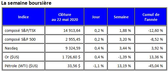 Les principaux indices boursiers nord-américains ont affiché des gains solides sur la semaine. Cette croissance a été principalement encouragée par l'optimisme découlant de la levée progressive des restrictions sur l'activité économique provoquées par le confinement lié à la Covid-19, et par l'espoir que la dégringolade des bénéfices du premier trimestre s'achèvera à la réouverture des activités. En outre, le sentiment des investisseurs s'est amélioré suite aux premières indications que les recherches mondiales d'un vaccin par des sociétés telles que Moderna Inc. (NSD: MRNA) pourraient porter leurs fruits dans l'année.